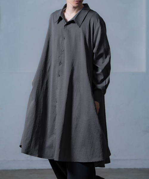 コートのような着こなしが可能なロング丈シャツが登場。●サラッと肌触りの良いポリ素材を採用●ややゆとりのある裾に向かってフレア気味に広がったシルエット●大きめの襟、フロントポケット、ステンカラーコートのような佇まい●ブラック、カーキ、チャコールの三色展開秋口のライトアウターとしても活躍してくれる一枚。ニットやカットソーと合わせてロングコートのような使い方がオススメ。メンズはもちろん、レディースにも合わせていただきたい仕上がりです。