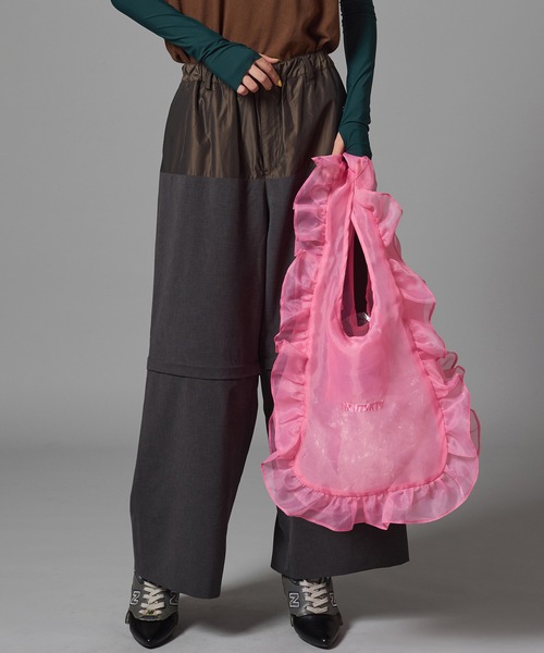 NON TOKYO 2026 S/S “NOT LOSING TO THE RAIN - NOT LOSING TO THE WIND” シアー素材のフリルエコバッグ。 両サイドを真ん中へ折りたたんでくるくる巻いて、内側に付いたゴムでまとめることで小さく収納して持ち運びが可能です。 バッグの内側には内ポケットが付いており機能性もあります。 表地は透け感のあるシアー素材を使用し、存在感抜群のデザインです。 フロントにはロゴ刺繍が入っています。 (2サイズ展開で、Sサイズもあります) ▼STYLING LOOK Lola 178cm 着用サイズFREE TSUGUMI 175cm 着用サイズFREE NON TOKYO 2026S/S COLLECTION “NOT LOSING TO THE RAIN - NOT LOSING TO THE WIND” 今季は「WORK」をコンセプトに、フリル、レース、チュールなどアイキャッチかつ女性らしいガーリーなディテールに、 撥水、防風性を高めた、機能素材、利便性のあるディテールを取り入れアイテムを提案。 雨ニモマケズ風ニモマケズ、どんな場面でも女性としての魅力をもちながら、立ち向かっていく「強い女性像」を描きました。 ANLIO OFFICIAL、ZOZOTOWN にて在庫発売いたします。 ANLIO OFFICIAL→会員10%割引 ZOZOTOWN →paypay、ZOZOポイント 各ショップによりサービス内容が異なります