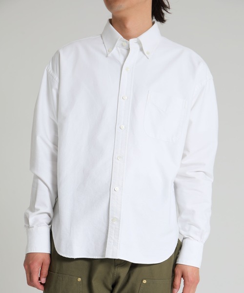 目地の粗い伝統的なオックスフォードクロスを使用したB.Dシャツ。左胸にパッチポケット、袖は剣ボロ仕様、両裾に三角マチ、前立て裾にケアラベル、背面襟下のハンガーループなどクラシックな意匠を盛り込んだデザイン。身頃の左脇にスクウェア型ネームを叩きつけ。身幅にややゆとりのあるシルエット。1色3サイズ展開。