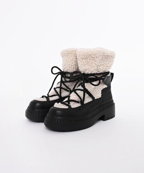 ボアレースアップブーツ 【ポイント】 ボアとレザーソールを組み合わせたデザインが印象的なブーツ。いつものスタイリングに取り入れるだけで、洗練されたムードを演出。存在感のあるディテールが足元からコーディネート全体を格上げしてくれます。 【デザイン・シルエット】 ボアとレザーをドッキングさせた存在感のあるデザインが魅力のブーツ。厚底ならではのボリューム感がスタイルアップを叶えつつ、足元に抜け感とモードな雰囲気をプラスしてくれます。ゴム仕様の靴紐を採用しているため、ファスナーが無くても着脱がスムーズでストレスフリー。さらに、ふんわりと暖かい履き心地とクッション性のあるソールが、長時間のお出かけでも快適さをキープ。デザイン性と実用性を兼ね備えた、毎日のスタイリングに取り入れやすい一足です。 【おすすめのスタイリング】 ブーツ自体に存在感はあるものの、モノクロカラーを採用しているためどんなアイテムともマッチする一足。デニムやスカートに合わせていただくのはもちろん、ロングコートを合わせて、歩くたびに見えるブーツがアクセントとなり◎秋冬に大活躍するブーツです。 【素材】 柔らかなボアが軽やかで、足元に心地よいあたたかさをプラス。ソール部分のレザーはさらっとした質感と耐久性を兼ね備え、履くほどに風合いを深めていきます。異なる素材の質感が引き立て亜衣、奥行きのある表情を生み出すブーツです。 ※ご覧のモニター環境や撮影環境により実際の商品と多少色味が異なって見える場合がございます、ご理解の程を宜しくお願い致します。 ▼商品のお気に入り登録をおススメ致します☆サイズやカラー横のハートマークをクリック! 完売カラーの再入荷や、ラスト1点の通知、セールの際の通知を受ける事ができます。 お気に入り登録も宜しくお願い致します♪