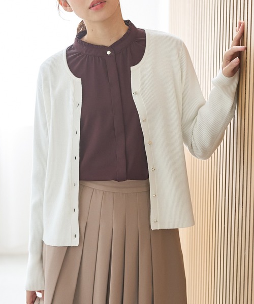 キラキラ素材の大人デザイン【デザイン】顔回りをすっきり見せるキーネックが、さりげない大人な抜け感を演出してくれるデザイン。繊細なラメが上品なアクセント。すっきり幅と腰にかかる丈感の程よくフィットするシルエットに、細めリブの縦目でスタイルアップ効果も◎【素材・機能】程よい厚みでロングシーズン使える、レーヨン混素材。柔らかで伸縮性もあり、ストレスフリーな着心地。【スタイル】ジャケットにも合うサイズ感でオフィスシーンにも使え、スカートにもパンツにも好相性。ワンピースやロゴTシャツにさらっと羽織るのはもちろん、ボタンを閉めてプルオーバーとして着ても◎品番:646-32-1500
