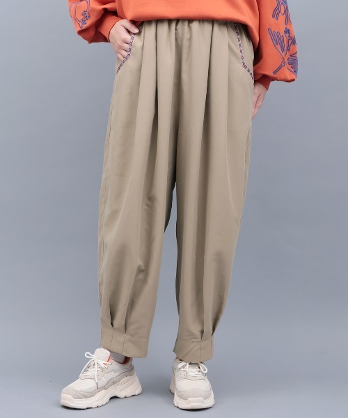 タックで腰回りゆったり、丸みがかわいい人気のエッグタックパンツ ■デザイン 人気シリーズの生地がリニューアル! サラッとタッチの微起毛素材、ハリ感がUPしました。 フロントに入れたタックで腰回りにゆとりを持たせつつ、裾に向かって自然にすぼまる丸みのある「たまご型シルエット」が特徴です。 ぽってりとした立体感がありつつ、全体のバランスはスッキリ見えるので、大人っぽく穿きこなせます。 ポケット部分には幾何学柄のテープをあしらい、さりげないアクセントに。 ■サイズ感 レディースM/Lサイズ ウエストはゴム仕様で快適な穿き心地。サイズによって丈感が違うので、自分のお好みで選べます◎ たっぷりとしたヒップ周りで、脚のラインを拾わないテーパード型。 エスニック好きな男性の方にもオススメです! ■素材感 ほんのり起毛感のあるハリ素材で、大人っぽく落ち着いた雰囲気に。 ■スタイリング ゆったりとしたトップスやシャツとの相性◎ シンプルなコーデにパンツの丸みをプラスして、こなれ感のある着こなしに仕上がります。 ブラウスと合わせてもサマになるコーデが完成します。 ■カラー ベージュ/ブラック/グリーン ■お手入れ洗濯機可/ドライクリーニング --------------------------------- 透け感:透けない 伸縮性:なし 裏地 :なし 光沢 :ややあり 生地の厚さ:普通 ポケット:あり --------------------------------- 【TITICACAのお買いものをお楽しみいただくために!】 ▼商品のお気に入り登録 完売カラーの再入荷通知や、ラスト1点の通知、セールの通知も受け取ることができます。 ▼ブランドのお気に入り登録 新商品や再入荷など、いち早くブランドのお得な情報を受けることができます!