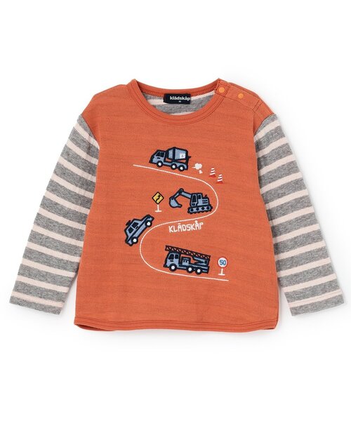袖の大胆な切り替えデザインがおしゃれな人気のTシャツです。働く車が走っている様子をダンガリーアップリケで表現しました。やわらかく肌触りが良い綿100%素材を使用。内側にお名前を記入できるタグつき。※80、90サイズのみ肩開き 【透け感】透けない【生地の厚さ】厚い【伸縮性】あり【裏地】なし【ポケット】なし