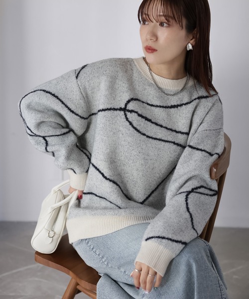 【Riberry ニュアンスラインラメニット】\さりげないラメがきらめく/ニュアンスラインが大人のこなれ感をプラスするデザインニット♪■Stylingさりげないきらめきとニュアンス感を楽しめる、デザインニットが登場しました。ベースの糸にラメが織り込まれており、光の当たり方によってほんのり輝きを放つのがポイント。大人っぽさと華やかさを両立し、普段のスタイリングに一枚プラスするだけで表情を変えてくれるアイテムです。フロント全体に描かれたニュアンス感のあるラインデザインはシンプルながらも印象的。ラフに描いたようなアートなタッチが、こなれ感を演出してくれます。クルーネック仕様で顔まわりはすっきりとし、合わせるアクセサリーも引き立ててくれるシルエットです!デニムやワイドパンツと合わせればカジュアルに、タイトスカートやセンタープレスパンツで合わせるとキレイ目コーデに様変わり◎ラメの輝きがほんのりと女性らしさを引き立てるので、シンプルなボトムでも華やかにまとまります。寒い季節にはコートのインナーとしてもアクセントになり、脱いだときに目を引くおしゃれな印象を与えてくれる一枚。デイリーからちょっとしたお出かけまでサラッと着れて、スタイリングの幅を広げてくれるラメラインニットです♪■Detailカジュアルにもキレイ目にも着こなせる、シンプルなクルーネックを採用。首元が詰まっていることで清潔感がありクリーンで柔らかな印象を与えてくれます♪首元、袖、裾はリブ編みなのでメリハリのあるデザインが特徴。程よい厚みで着ぶくれしにくく、ロングシーズン活躍可能な生地感です!■Materialポリエステル・ナイロン・アクリル・ポリウレタンの混紡素材を使用。もっちりとした暖かみのある素材で、伸縮性もあり動きやすく、着心地は快適♪ナイロン混ならではの程よいハリ感がシルエットを美しく保ち、デイリーに取り入れやすいバランスになっています。▽生地感透け感:あり 〇〇〇●〇 なし生地の厚さ:厚い 〇〇〇●〇 薄い裏地:なし伸縮性:あり※この素材は性質上、発汗、摩擦等により、ほかの衣料やバッグなどに多少色落ちや色移りする場合がありますので、十分にご注意下さい。※商品の梱包には細心の注意を払っていますが、通販の特性上、到着時に畳みシワがついている可能性がございます。予めご了承ください。※お肌のデリケートな方は刺激を感じる場合がございます。※詳しいお手入れ方法は商品タグをご参照ください。【Information】◆《お気に入り登録》がオススメ◆・「商品のお気に入り登録」で再入荷通知や、ラストの通知、セール通知も受け取ることが出来ます。・「ブランドのお気に入り登録」で新商品や再入荷など、お得な情報を受け取ることが出来ます※撮影時のライティング、太陽光、ご覧になっているモニター・PC環境により、実際の商品と色味が異なって見える場合がございます。予めご了承をお願い致します。