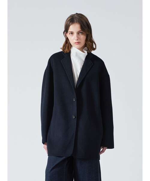 リバーフェイス素材を使用したウールテーラードジャケットです。mizuiro ind人気のアウターで、一枚仕立てでも軽さと保温性の高さが魅力。 ビッグサイズでメンズライクに仕上げたサイズ感で、 ヒップをしっかりと隠れるほどの丈やストレートのかっこいいシルエットを表現。 深めのテーラードなのでフロントをオープンにしても素敵です。 中にも着こみやすいサイズ感となっています。襟を立てても素敵で寒さ対策としてもお勧め。 ネイビーとブラックの2色に絞ったトラッドなアウターで長く愛用していただける1枚です。 Point 袖丈:長袖 デザイン:無地 ネック:テーラード Detail 裏地:なし 透け感:なし 伸縮性:多少あり 光沢感:なし ポケット:サイド ※商品画像は、光の当たり具合やパソコンなどの閲覧環境により、実際の色味と異なって見える場合がございます。予めご了承ください。 ※商品の色味の目安は、商品単体の画像をご参照ください。 こちらの商品 は mizuiro ind / MARcourt にてお取り扱いしております。 店舗在庫等については直接店舗にお問い合わせください。