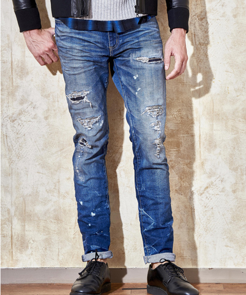 185cm C96-W74-H90 靴28.0cmのモデルが2サイズを着用国産ジーンズ発祥の地として有名な岡山県児島市にて生地選びから裁断、縫製、加工を一貫して生産した極上のデニムパンツシリーズです。シルエットはスッキリとしたテーパードタイプで素材には12ozのストレッチ入りのデニム生地を使用しているのでストレス無く着用して頂けます。フロントトップは月桂樹釦を採用しヴィンテージ感を演出。フロント仕様は履き易さを尊重し、YKK社製のジッパーフライを採用しています。長い年月の中で生まれたダメージ、立体ヒゲ加工、汚し、ブリーチ加工、絶妙な色落ちを様々な職人が全てハンドメイドで手間をかけて施し、加工を追及したVERTEX&CO.ならではの渾身のダメージデニムが実現しました。