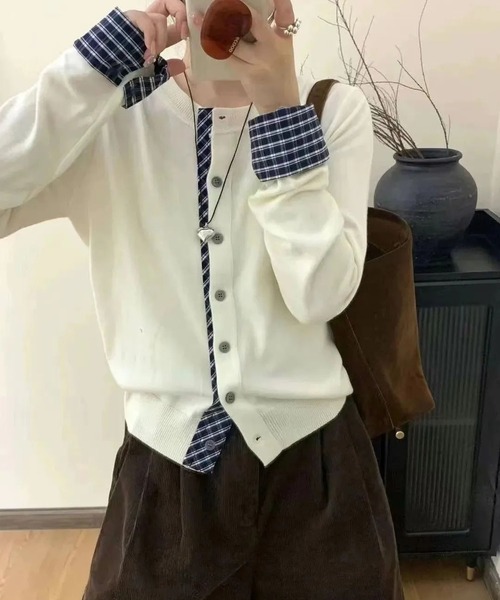 【大人の遊び心をプラスしたパッチワークデザイン】異なるトーンのバイカラーと、袖口・裾に施されたチェック柄パッチワークが印象的なカーディガン。シンプルなシルエットながらも細部のデザインで存在感を放ち、羽織るだけでおしゃれなスタイリングが完成します。大人のカジュアルコーデに個性を添える一枚です。 【ふんわり柔らかな着心地と抜群の汎用性】肌触りの良いニット素材で仕立てられており、軽やかでストレスのない着心地が魅力。薄すぎず厚すぎない中肉感で、季節の変わり目から冬本番まで長く活躍します。Tシャツやブラウスの上にさらっと羽織るだけで、シーズンムードを高める着こなしが叶います。 【コーデを引き締めるスマートなシルエット】コンパクトすぎない程よいゆとりのシルエットで、パンツにもスカートにも好相性。デニムと合わせてカジュアルに、ワンピースの上から羽織ってきれいめにと、幅広いスタイリングにマッチします。トレンド感と着回し力を兼ね備えた、ワードローブに欠かせないアイテムです。 ※店頭及び屋外での撮影画像は、光の当たり具合で色味が違って見える場合があります。またご覧いただきますモニターや使用環境により実際の商品と多少色味が異なって表示される場合がございます。予めご了承をお願いいたします。★商品のお気に入り登録→【カートに入れる】右側の♡をクリック★ブランドのお気に入り登録→ブランドタグのページからお気に入りをクリック※ご注文いただいた予約商品のお届け時期の確認は、注文履歴ページより行えます。※セールは予告なく終了させていただく場合がございます。