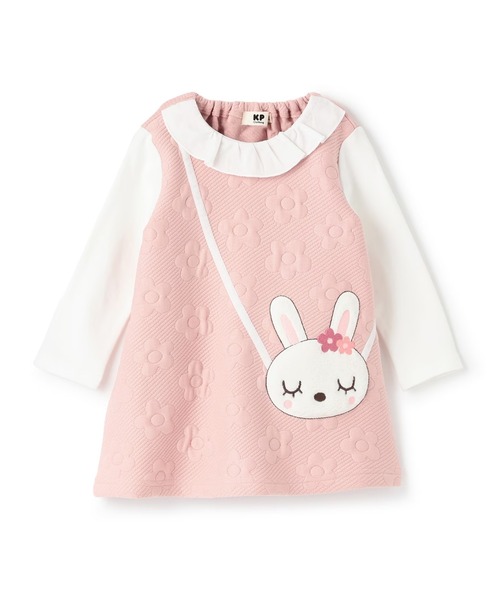 ぽこぽこと凹凸で花柄を表現した、やわらか素材のワンピース。mimiちゃんのポシェットを提げているかのようなアップリケ刺しゅうが目を引きます。白いフリルの衿と袖は、ジャンパースカートに、ブラウスをレイヤードしているように見えるデザインで、華やかさをプラス。これ1枚でコーディネートが完成する、可愛らしさと着やすさを兼ね備えたアイテムです。