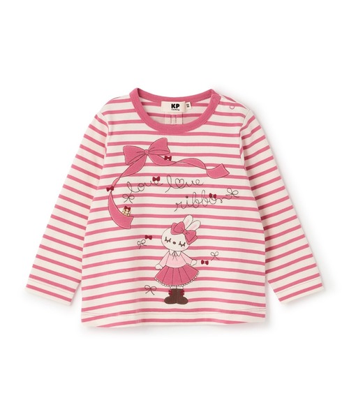 ボーダー柄に、mimiちゃんのアップリケが映える長袖Tシャツ。軽くふんわり広がるAラインのシルエットで動きやすく、後ろ身頃には小さな立体のリボンがついた愛らしいデザインです。80、90㎝は、着脱しやすい左肩開きの仕様。