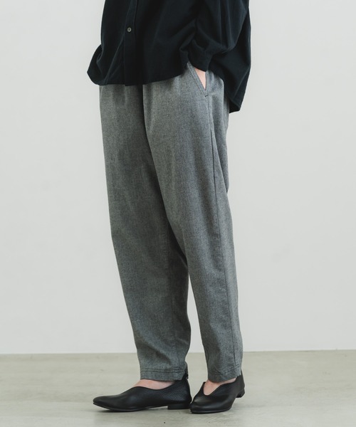 股上を深めに取ったサルエルデザインのパンツです。太めのシルエットですが裾幅を細く取っている為、スッキリと野暮ったさのないシルエットに。ウエストはゴムと内側にドロストのイージーな着用感も嬉しいポイントです。テーパードシルエットの為トップスのシルエットを選ばずスタイリング頂けます。季節の変わり目はシャツワンピをザックリ羽織ったスタイリングもおすすめです。【ソフトサーモストレッチ】40/2の綿TOP糸とアクリルレーヨンの混紡糸(ソフトサーモ)を組み合わせた先染ストレッチ素材。ソフトサーモの持つ機能性はもちろん、アクリルレーヨン糸のソフトな風合い感も特徴です。一見まるでウールのような見え方をする新感覚素材です。