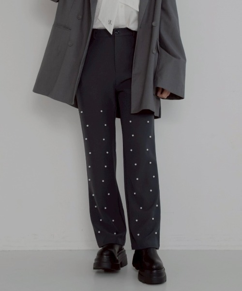 -パールストレートスラックス-パールの装飾を施したスラックスパンツ。トレンドライク見た目で合わせやすいスラックス使用に。年中ご着用頂ける生地感です。少しフォーマルにも着こなせるのでパーティーシーンにも是非。人気のフレンチガーリースタイルにもおすすめ。合わせやすいグレーと、コーディネートのポイントになるピンクの2カラーでご用意致しました。・・・・・・・・・・・・・・・・・・・・・・・・・・・・・・・・・・・・・・・・・・・・・・・◆アイテム詳細素材…ポリエステル100%透け感…なし生地の厚さ…普通 伸縮性…なし裏地…なし・・・・・・・・・・・・・・・・・・・・・・・・・・・・・・・・・・・・・・・・・・・・・・・◆サイズ感身長や体形に合わせて選べる2サイズ展開。タイトすぎず、ゆるすぎないサイズ感で程よく着痩せ効果も◎◆スタイリングパールの上品な印象を、スウェットやカットソーなどカジュアルなアイテムと合わせるのがjumelleらしい着こなし。ブラウスなどガーリーなアイテムと合わせればガラッとドーリーな印象も楽しめます◎-キーワード-スラックス パンツ セミオケージョン 入学式 入園式 卒業式 卒園式 バレエコア カラーコーデ 差し色 カラーパンツ 美脚パンツ ガーリー パール 低身長 デート キレイ目 女子会 ランチ