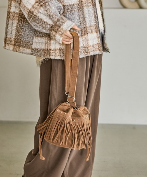 フリンジデザインがアクセントになった巾着バッグ。ショルダー紐が取り外し可能なので、2WAYでお使いいただけます。スエード調の素材を使用し、取り入れる秋冬らしいスタイリングが完成します。さりげないスタッズもポイントになり、上品にもカジュアルにも合わせやすいアイテムです。内側には小物を収納できるポケット付き。