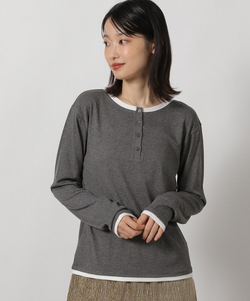 前後2WAYで着用いただけるインナーアイテム。 シンプルながらも襟と袖口にデザインされたパイピングがアクセントになった1枚です。 薄手の素材感でも身頃にゆとりがあるので着やすさもポイント。 【素材】 レーヨン混で伸縮性のある柔らかく肌触りのよい素材感。 【スタイリング】 合わせるアイテムを選ばずスタイリングできるアイテムです。 1枚着はもちろん羽織のインナーや、サロペットなどのインナーとしてもおすすめ。