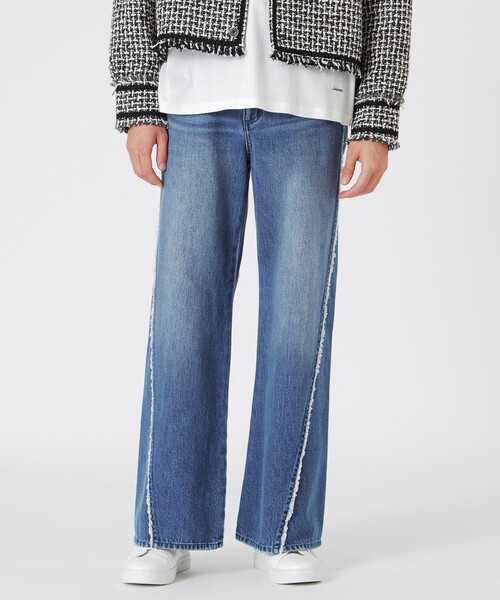 斜めに入った切り替え線がアクセントになったブリーチデニム【素材】素材には、コットン100%の11オンスのインディゴデニムを使用。重すぎずしなやなかデニム素材です。ブリーチ加工により、程よく色落ちしたユーズド感のある表情が特徴【シルエット/デザイン】ゆったりとしたワイドストレートシルエット。斜めに切り替えが入った構築的なデザインで、切り端にはほつれ加工を施しフリンジを残すことで程よいカジュアルさやこなれた印象に仕上げました。フロントのネオバ釦やリベットといったシルバーがカラーアクセント。ネオバ釦には、実際にハンマーで打ち込まれたようなゆがみのあるタイプを使用しています。【スタイリング/その他】シャツと合わせたきれいめミックスカジュアルスタイルやオーバーサイズのスウェットやニットと合わせた大人ナチュラルスタイルがオススメです。━━━━━━━━━━━━━━━━━━━━━━━━━━お買い物をお楽しみ頂くために<商品のお気に入り登録>完売カラーの再入荷通知など、お得な情報をお届けします。<注意事項>この商品はサンプルでの撮影を行っています。実際の商品とイメージが異なる場合がございます。撮影環境により、光の当たり具合で色味が違って見える場合があります。あらかじめご了承下さい。