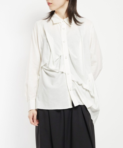 2025-26 AUTUMN/WINTER COLLECTION ■design ・柔らかな綿ウールビエラ素材を使用した、上品なブラウス。 ・タックやつまみを施したフォルムがモード感あふれるアイテムに。 ・アシンメトリーデザインが存在感を放ち、一枚で主役級に。 ・透け感があるため、柔らかな印象を与えつつもシャツカラーで綺麗に仕上げました。 ・モード感と上品さを兼ね備えたアイテム。 ■fabric ・綿とウールを混紡したテキスタイル。 ・適度なウォーム感がありながら、柔らかく光沢感があることが特徴。 ■coordinate ・ワイドパンツを合わせたシルエットが意識したコーデ。 ・羽織としてワンピースと合わせても◎ ‥‥‥‥‥‥‥‥‥‥‥‥‥‥‥‥ 厚さ:薄手 透け感:あり 伸縮性:なし 光沢感:あり ポケット:なし 裏地:なし ※詳しいお手入れ方法は商品タグをご参照ください。 ‥‥‥‥‥‥‥‥‥‥‥‥‥‥‥‥ 《お知らせ》 ・商品画像はご覧のモニター環境により、実物の色味と多少異なる場合がございます。予めご了承ください。 ・「商品のお気に入り登録」で再入荷・値下げ・在庫1点などの通知を受け取ることができます。 ・「ブランドのお気に入り登録」で新商品や再入荷など、お得な情報を受け取ることができます。 ※他のキャンペーンにより、期間中に価格が変動する場合があります。 ※セールは予告なく終了させて頂く場合もあります。