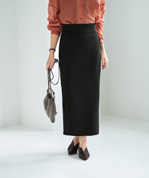 びっくりするほどシュッとして見える、 クールなブラックの伸縮Iラインスカート ◆とてもよく伸びる、もっちりとしたジョーゼット生地=ストレッチジョーゼットで作られたシンプルなIラインスカート。下腹部にハギ線(生地の切り替え線)が入っており、さりげなく上の方に視線を集めて脚長効果が生まれるようになっています。 ◆締め付けとは異なる感じで自然に身体にフィットするフォルムで、穿くと驚くほどに身体が細く見えるのがこのスカートの特徴。独特のもっちり感によりピチピチにはならず、心地の良いフィット感でスッキリとしたラインを作ってくれます。 ◆ブラックの染料を入れたときに、色が深く入るのもこの生地の特徴。そのため黒の色が濃く・深く、クールでスタイリッシュな印象です。 ◆生地は全体的によく伸びるため、ウエスト位置の調節も自在。少し長めに穿きたいときは腰に落としてもカッコ良く、バランスに合わせて調節ができます。 ◆一見するとなんてことはないシンプルなスカートなのですが、とにかく穿くとめちゃくちゃ素敵なので、試すと虜になってしまう人が続出。スニーカーやTシャツ合わせのカジュアルな格好から、セミフォーマルなシーンまで幅広く使えるところも持っておきたい!と思えるポイントです。 ◆サイズ感:基本的にはS-Mサイズ。ただしよく伸びるためLサイズの方も穿くことは可能。トップスの裾をインして穿くにはある程度の体型的スッキリ感は必要ながらも、スリム体型である必要はナシ。普通体型に対する体型カバー効果は絶大。多少のお肉は完璧にカバーしますが、一定レベルを超えると響く感じです。 ◆暖かさ:とくに暖かさを重視しているわけではない通年対応生地。冬場もぜんぜん問題なく穿けますが、特筆するほどの目立つ暖かさはありません。夏はOKな方と暑いと感じる方に分かれる感じかと思います。 ◆シワ:とくにシワが気になる生地ではなく、アイロン掛けは不要です。もしも気になる場合はスチーマーの方が向いており、簡単に伸ばすことができます。 ◆静電気:しっかりとしているため薄手のポリエステル生地ほどには気になりませんが、その方の帯電体質具合やタイツ等の合わせアイテムなどに加え冬場は乾燥もありますので、もしも気になる場合は静電気防止スプレー等でご対処ください。ペチコート類を入れるのも脚へのはり付き防止に有効です。 【その他の仕様】 ◆着用時期:通年 ◆サイズ感:SもOKのMサイズ/体型に合わせて自然にゆるフィットする感じ ◆丈感:普通身長でくるぶし上の丈感 ◆シルエット:Iライン ◆ウエスト:全体が伸びる生地 ◆ウエストの締め感調節機能:なし ◆ベルトループ:なし ◆厚み:普通-しっかりめ ◆柔らかさ:ハリ感としなやかさ&柔らかさが共存 ◆肌触り:シャリ感のようなサラッと感/肌離れが良い感じ ◆着用ジワ:できにくい ◆毛羽立ち:できにくい ◆伸縮性:かなりあり ◆光沢感:なし ◆透け感:なし ◆スリット:背面の裾にあり(26cm程度) ◆ボタンやファスナー:なし ◆ポケット:なし ◆裏地:なし ◆手洗い:可能 ◆裾上げ:お直しに出していただけます ◆アイロン:不要 ◆スチーマー:使用OK 【お知らせ・ご注意事項】 出荷前に色留め加工はしておりますが、濃色のストレッチジョーゼット素材は稀に色移りをおこすことがございますので、淡色のトップスや上着や下着やバッグ、明るい色の家具・雑貨・小物等への移染に念のためご注意ください。 とくに雨の日や湿度の高い日、汗をかいた日やムレなどの環境下でおこる摩擦に弱く、反応をおこす可能性があるという特徴があります。 ◆ご使用前に一度手洗いをしていただくとリスク軽減になりお薦めです。 ◆手洗いをする/手洗いを重ねることでリスクは軽減されていきます。もしも改善が見えない場合はドライクリーニングに一度出すのが有効です。 ◆こちらは素材の持つ一般的な特性となりまして、品質の良し悪しとは関係がありません。そのため万が一のトラブルがおきた際は免責とさせていただきます。