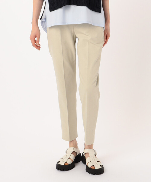 「ドライな質感で涼しく、足長効果が期待できるパンツ」 《デザイン》 細身のシルエットでもぴったりしすぎないパンツです。 後ウエストにゴムを入れているので着心地も楽です。 天然素材のナチュラルな雰囲気も持ちつつ、センタープレス入りのきれいめな仕上がりなので普段着からお仕事着にまて使える一着です。 《素材》 綿麻混で天然感がありながらストレッチ性もあり、機能性に優れた素材です。 たて糸に吸水性に優れたポリエステル糸を使用しています。 さらに、光の透過を抑える機能もあるので白でも透けにくく、裏地なしでも、安心して着られる素材です。 ※お手入れ方法:手洗い可能です。