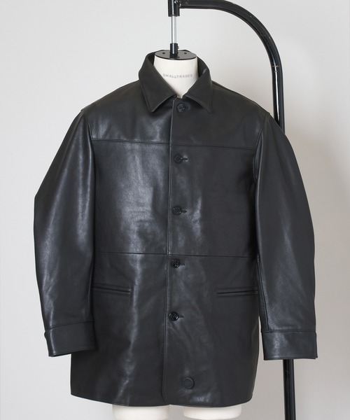 ユーロヴィンテージのカーコートをベースにデザインしたレザーコート。 ミドル丈で扱いやすく、コートとしてもジャケットとしても着用できます。肘周りにゆとりを持たせることで袖全体に生まれる曲線的なシルエットが特徴的です。 商品名の由来は、かつてヨーロッパで車を購入するとカーコートが贈られていたという事から着想を得ています。 生地はバッファローレザーを使用。 経年変化が豊かで、丈夫で耐久性が高く重厚感のある質感が特徴です。
