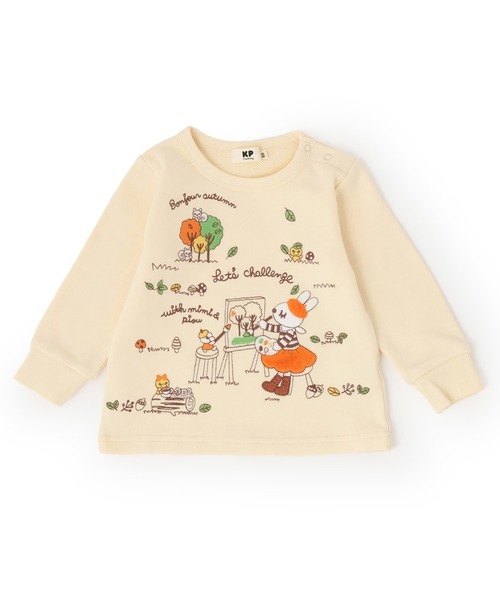 mimiちゃんが自然の中でPiouとスケッチを楽しむ光景をアップリケと刺しゅうであしらったトレーナーです。着るだけで、ほっこりと楽しい雰囲気を楽しめそうです。80、90㎝は、着脱しやすい左肩開きの仕様。
