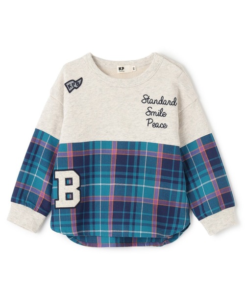 胸下から大胆にチェック柄で切り替えたトレーナー。胸に刺しゅうと、右裾には大きめのレタードワッペンが付き、裾の馬乗りになったカットもデザインポイントです。同じチェックの生地づかいのKPのチュニック (2153207) とは、兄妹でリンクコーデも楽しめます。90㎝は、着脱しやすい左肩開きの仕様。
