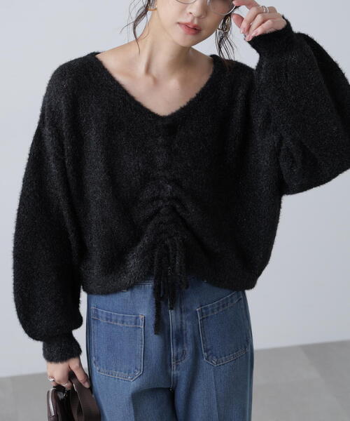 ミニシャギーのふわふわとした風合いのメッシュ編地がかわいいニット。センターにドロストデザインを施し、ギャザーが作り出す表情がポイント。総針リボンの絞り具合でお好みの丈感に調整できます。前後2WAYで表情を変えられるデザイン。キャミやタンクと合わせたヘルシーなスタイリングから、シャツやシアートップスとのコーディネートもおススメです。※モデルの着用画像の場合、光の当たり具合により、実際の色味と異なって見えることがございます。色味は、商品単体の画像をご参照ください。商品特性■透け感:あり■生地の厚さ:普通■裏地:なし■伸縮性:あり■光沢:なし■シルエット:スタンダード---------------------------------------------------◆商品のお気に入り登録◆お気に入りアイテムの値下げ・再入荷・在庫1点などの通知を受け取ることができます。◆ブランドのお気に入り登録◆新商品や再入荷、セール、クーポン配布などお得な情報を受け取ることができます。---------------------------------------------------