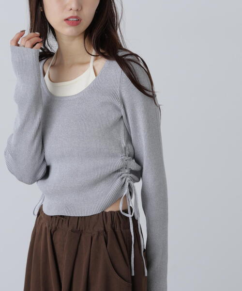 一枚でレイヤードが完成するデザインニット。もちっとした肌触りのリブニットに、ホルターネックを重ね着したようなデザインです。ホルターネックは脇下ではぎ合わせているため、着崩れを防ぎながら着心地も良いです。程よいタイトなボディ感ですが体のラインを拾いにくい肉感です。両サイドのドローストリングで着丈の調整可能。デニムはもちろん、ミニスカートとブーツを合わせた、ヘルシーな着こなしもおすすめです。※モデルの着用画像の場合、光の当たり具合により、実際の色味と異なって見えることがございます。色味は、商品単体の画像をご参照ください。商品特性■透け感:なし■生地の厚さ:普通■裏地:なし■伸縮性:あり■光沢:なし■シルエット:スタンダード---------------------------------------------------◆商品のお気に入り登録◆お気に入りアイテムの値下げ・再入荷・在庫1点などの通知を受け取ることができます。◆ブランドのお気に入り登録◆新商品や再入荷、セール、クーポン配布などお得な情報を受け取ることができます。---------------------------------------------------