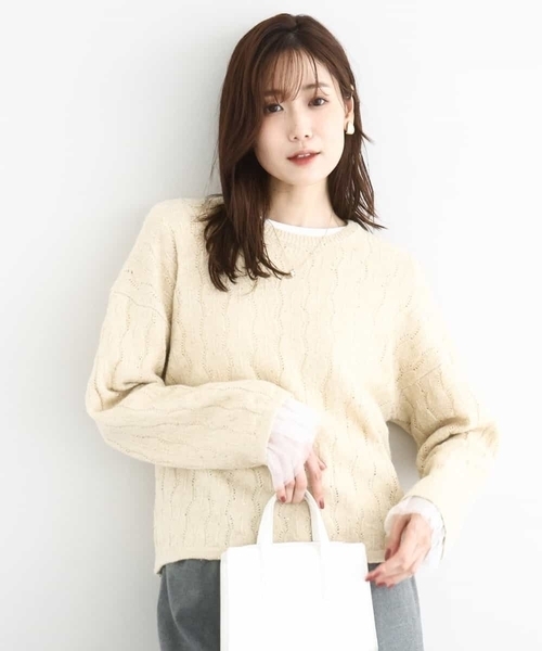 見た目にも可愛い!シーズンムードを盛り上げるキラキラニット ■デザイン 今季も人気の高いキラキラのラメ入りトップス。ケーブル風のぽってりし過ぎない編み柄が気軽に一枚着しやすいデザインです。 ■素材 ラメ糸とスパンコールがミックスされた軽くソフトな風合いの素材を使用。見た目にも暖かみがあり、寒い季節にぴったりな一枚です。 ■コーディネート 長すぎない着丈は、パンツやスカートのボトムにインせずにそのまま決まるのが嬉しい。一枚ではもちろん、インナーを重ねて裾から見せたり、袖口から覗かせたり、衿周りの変化を楽しんだりと、様々な着こなしも楽しめる優れものです。 -------------------- 着用シーズン 春:△ 夏:× 秋:◎ 冬:◎#秋服 #冬服 -------------------- 洗濯表示:手洗い可 透け感:あり 裏地:なし 伸縮性:あり 生地の厚さ:ふつう -------------------- ※自然光・照明の関係、パソコン・スマートフォンなどの環境により、実際と色味が違って見える場合がございます。予めご了承ください。商品の色味は、詳細画像をご参照ください。 ※サンプルでの撮影となるため、実際にお届けする商品と仕様やサイズが異なる場合がございます。