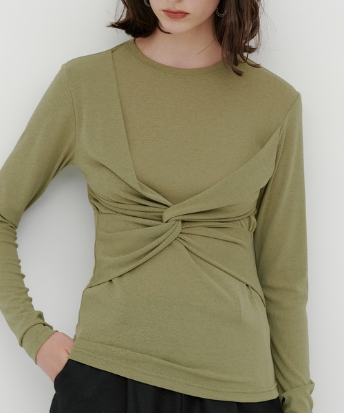 【スラブ ツイスト トップス】フロントの大胆なツイストデザインが主役のカットソートップス。 シンプルながらも動きのある表情が生まれ、無地でも華やぐのが魅力。 ツイスト部分はウエストの細みせ効果もあり、着るだけでよりスタイルを良く見せてくれます。 落ち感のあるスラブカットソーはさらっとした肌触りで心地よく着られます。 毛玉になりにくいため扱いやすく、デイリーにお使いいただけます。 スラブの薄い部分はやや透け感があり、濃色カラーが素材の特徴を上品にまとめてくれます。 落ち着いた雰囲気のバーガンディーとトレンドのグリーン、普段使いしやすいブラックの3色展開です。 ミニマルなボトムスに合わせてもこなれ感が生まれ、映えるカラーがコーデの主役になります。 落ち着いたカラーバリエーションはこれからの季節に大活躍するはず。 #KTWR48 素材: ポリエステル96% ポリウレタン4% サイズF 丈60cm 肩巾35cm バスト76cm 袖丈63cm ― 備考 ― 伸縮性:あり 透け感:なし 〇〇〇●〇 あり 生地の厚さ:薄い 〇●〇〇〇 厚い 洗濯:可 ウエットクリーニング:可 ー Attention ー ※色落ち、色移りにご注意下さい。 ・濡れたまま長時間放置すると、色落ちの原因となることがありますので速やかに乾かしてください。 ・湿った状態や着用時の摩擦により、他の物に色移りする可能性がありますので、ご注意ください。 ・白や淡色系のベルト、バッグなどにも色移りすることがありますので、ご注意ください。 ・洗濯時は他の衣類と一緒に洗わず、単独で洗うことをおすすめします。 ・色移りが発生した場合は、早めに洗濯またはクリーニングを行うことをおすすめします。 ※お届け予定時期は変更となる場合がございます。あらかじめご了承下さいませ。 ※商品のお色味は、お使いのバイスや撮影時の照明等により、実物と若干異なって見える場合がございます。 また、撮影ではサンプルを使用しておりますため、実物の商品と若干サイズ感や仕様が異なる場合がございます。 ※お取り扱いにつきましては、品質表示とアテンションタグを必ずご確認下さいませ。 【kiehtova -キエトバ-】 無駄のないミニマルな様式美をコンセプトに、 いつまでも美しく身につけられる実用性を追求したデザイン シンプルなコーディネートを格上げするこだわりのジュエリーなど 芯の強い女性のトータルコーディネートを提案します 《お気に入り登録》でお得な情報盛りだくさん ・“商品のお気に入り登録”で再入荷通知やラストの通知、セール通知も受け取ることができます。 ・“ブランドのお気に入り登録”で新商品や再入荷など、お得な情報を受け取ることができます。 ※ご注文いただいた予約商品のお届け時期の確認は、注文履歴ページより行えます。