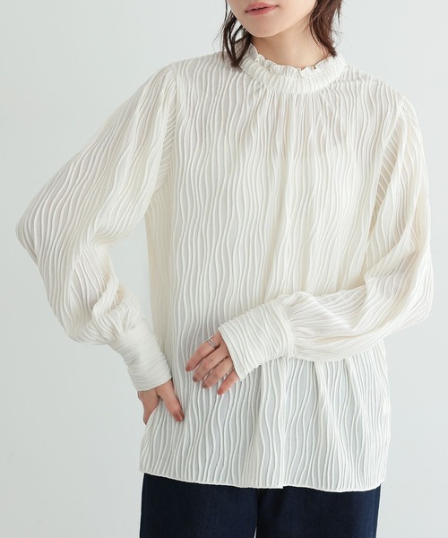 ブラウスなのに着心地楽ちん!楊柳カットソーブラウス。 オフィスからお出かけまで幅広く活躍するブラウス。 動きやすい柔らかなカットソー生地を使用し、 快適な着心地に。 きれいめにもカジュアルにも決まる、 着回し力抜群のアイテムです。 表面感のある楊柳カットソー生地。 やや薄手の生地感で、重ね着も楽ちん。 伸縮性があり、快適な着心地を叶えます。 ※アイボリーは透け感がございますので、インナーのご着用をおすすめします。 さりげないスタンドフリルが上品さを演出し、後ろは涙開きで着脱もスムーズ。 長めのカフス、ボタンデザインがポイントに。
