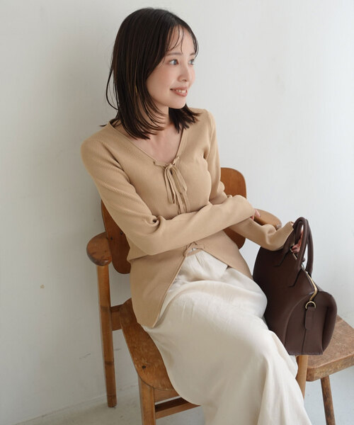◆今シーズンも大好評!一枚で簡単に着映えの叶うトップスがWEB限定にて再入荷!※商品番号25080240101010・25080240102030の追加商品です。※若干の仕様変更がある場合もございます。スタイリッシュにもフェミニンにも振れるデザイントップス。強撚のレーヨンポリウレタンで作られた、適度にもっちりとした肌触りの良さが嬉しい。フロントにあしらった同素材のリボンのレースアップがデザインポイント。リボンは結んだり、垂らしてラフさを出してクールさを加えるのもおすすめです。フロントの着映えデザイン、ジャケットやアウターの中に入れやすいシルエットも相まって、インナーとしても重宝していただけること間違いなし。鎖骨が綺麗に見える計算された衿ぐりが、女性らしさを引き立ててくれる一枚です。シンプルにさらっと着ても、ネックレスなどアクセサリーを合わせて華やかに着用も◎※ブラック(001)色落ち:着用中の摩擦や汗、水などで濡れたことによる他のものへの色移りにご注意ください。**********************透け感:なし裏地:なし伸縮性:あり光沢感:なし生地の厚さ:普通**********************【スタッフ着用コメント】年齢20代/身長:155cm/体型:/普段サイズ: 34~36 /着用サイズ:フリーサイズ感:フィット感がありコンパクトなサイジングですが、伸縮性があり身体に馴染んで着られます。着丈はやや長めで、お尻にかかるくらいの長さでした。素材感:シャリ感がありドライタッチ。着心地:さらりとしていて涼し気な風合い。生地自体は薄手ではないので、春の始まりから気温が高くなる前まで、長く着られそうです。**********************※取り扱いについては、商品についている品質表示でご確認ください。※こちらの商品は、NOBLEでの取り扱いになります。直接店舗へお問い合わせの際はNOBLE店舗へお願い致します。※照明の関係により、実際よりも色味が違って見える場合があります。またパソコン・スマートフォンなどの環境により、若干製品と画像のカラーが異なる場合もございます。ブラック・ベージュ着用スタッフ身長:155cm 着用サイズ:フリーモデルサイズ:身長:162cm 着用サイズ:フリー本体:手洗い可能