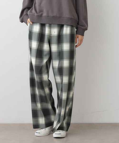 【デザインポイント】チェック柄のパンツ。ウエストゴムのゆったりとしたシルエットで楽に穿いていただけるパンツです。【スタイリングポイント】チェック柄で存在感があるので、トップスはシンプルめなシャツやカットソー合わせがおすすめです。キッズとのリンクコーデが可能です。【素材ポイント】ポリエステルながらスパン糸を使用しているので、マットな質感の素材です。【仕様】・ポケット数:横×2 後ろ×2・前ファスナー・ウエスト総ゴム・裏地なし※こちらの商品はやや透け感があるため、インナーの着用をおすすめします。【推奨サイズ】 ※こちらはユニセックス商品です。02サイズ:レディースM・メンズS 相当04サイズ:レディースLL・メンズL 相当※照明の関係により、実際よりも色味が違って見える場合があります。また、パソコン・スマートフォンなどの環境により、若干製品と画像のカラーが異なる場合もございます。モデル情報:身長166cm B72 W62 H86 着用サイズ:02(M)店舗へのお問い合わせ商品番号:S38-64210●製品寸法:02(M):W70cm H105cm 股下70cm 前股上30cm 渡り幅35cm 裾幅28cm04(LL):W82cm H105cm 股下74cm 前股上29cm 渡り幅35cm 裾幅23cm備考: