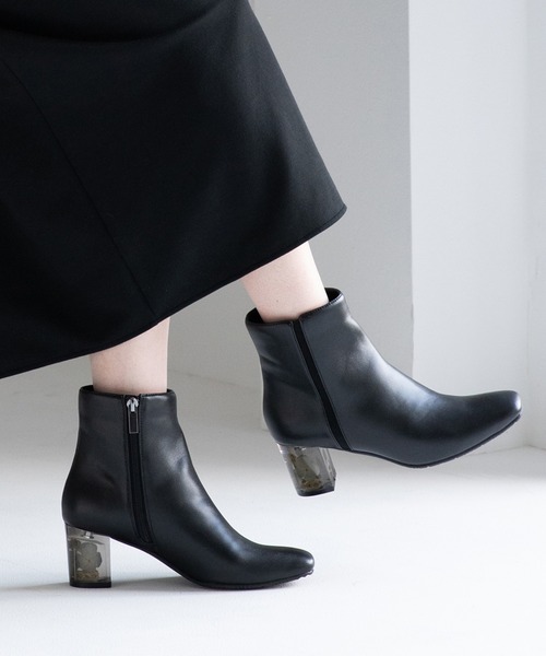 サンダルで人気のフラワー入りクリアヒールがついにブーツで登場!秋らしいクリアカラーのヒールにすることでブーツとも違和感なくマッチするように仕上げました。本体のカラーに合わせ、それぞれ違う色のフラワーを使用したこだわりのカラーバリエーションを揃えました。サイドの切り替えラインがアクセントになったシンプルなショートブーツは履き回し力◎履くだけで気分が上がる華やかな1足です。※撮影は室内で行われており、ライティングにより実物と色味が少し異なる場合がございます。