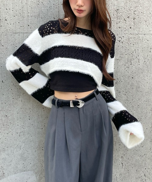 ーーーメッシュ×シャギーでボーダーデザインになってショートニット!レイヤードにおすすめなアイテムですーーー・・・・・・・・・・・・・・・・・・・・・・透け感:やや透ける(ホワイトで計測しています)伸縮性:あり生地の厚さ:普通裏地:なし・・・・・・・・・・・・・・・・・・・・・・<3.3 Field Trip/3.3フィールドトリップ>ブランド名にある3.3はその名の通り「3.3平方メートル」を意味し、3.3 Field Tripと一緒なら、いつでもどこでも快適にリラックスできるという意味が込められています。「We love Brooklyn」をモットーに、実用的でありながらスタイリッシュなルックとナチュラルさを追求したALANDのプライベートブランドです。▼取扱いSHOP:ALANDファッション、雑貨、コスメなどさまざまなブランドを取り扱う韓国発のストリートセレクトショップ。2020年秋、待望の日本上陸を遂げたALANDは、韓国の新進デザイナーとサブカルチャーを発掘し、その価値を最も魅力的な方法でマーケットに発信する唯一のライフスタイル型ストリートセレクトショップです。【お気に入り登録がオススメ】・商品のお気に入り登録「在庫残りわずか」「完売カラーの再入荷」「セール」の通知を一足早く受け取ることができます。気になった商品はまずお気に入り登録へ!・ブランドのお気に入り登録お気に入り登録したブランドの新作や再入荷等、ブランドのお得な情報を定期的に受け取る事が出来ます。※屋外の光や照明の当たり具合で、実際の商品の色味とカラー別画像の色味に違いが発生する場合がございます。 商品の色味はスタジオ撮影の詳細画像にてご確認ください。※サンプルにて撮影をしておりますので、実際の商品とは仕様や加工・サイズ等が若干異なる場合がございます。