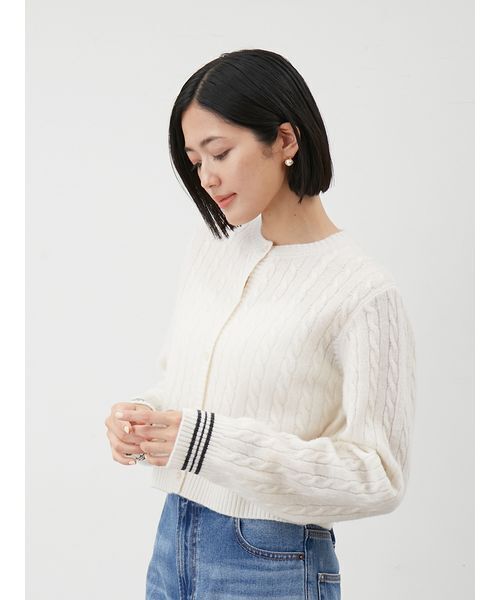 【プレッピーなライン入りで今年らしさアップ。肩掛けや持ち歩きにも最適、カシミヤのような極上タッチのケーブル編みカーデ】【Design/Styling】スッキリとしたクルーネックで、シンプルながら今年らしさをアップさせてくれる、ケーブル編みのカーディガン。軽く羽織れるので、季節の端境期に持ち歩くにもぴったり。羽織りとしても、前を閉じてプルオーバーとしても着こなせる一枚です。毛足のあるウールで、ふんわりと柔らかく軽く仕上げていて、まるでカシミヤのような着心地の良さ。身体のラインを拾わないケーブル編み。また、ボックスシルエットで身幅は広めなのに、短めな丈設定なのも今年らしいポイント。コンパクトな丈感はトレンド感溢れ、新鮮な印象です。上質な素材感とトラッドな編み地で、シーンレスに着用できるのも魅力。袖にはスポーツニットを思わせるトラッドなライン入り。腰に巻いたり、肩から掛けて袖のラインを見せる着こなしもおすすめです。【Fabric】ウールに、伸縮性のあるポリウレタンをプラスした、まるでカシミヤのような着心地のよい糸を編み立てています。カラーは3色をご用意。クリーンな印象の<WHT>、シックで秋らしさアップの<MOC>、モード感ある<GRY>で展開しています。※照明の関係により、実際よりも色味が違って見える場合があります。またパソコン・スマートフォンなどの環境により、若干製品と画像のカラーが異なる場合もございます。予めご了承ください。商品の色味は、商品単品画像をご参照下さい。 ※商品画像はサンプルのため、色味やサイズ等の仕様に変更がある場合がございますので、予めご了承ください。