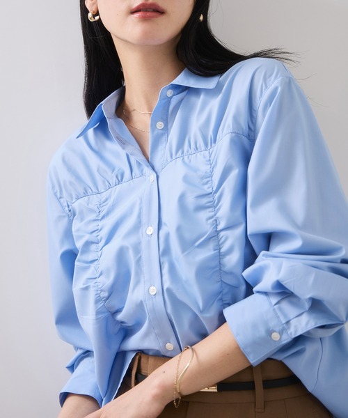 切替がスタイルアップを叶える!フロントギャザーシャツ。◆2025秋冬◆<POINT>・フロントの切替がポイント。・コンパクトめなサイズ感で羽織にも◎・さらっとしたシャツ地でシーズンレスに着用可能。・嬉しいマシンウォッシャブル素材。【デザイン・シルエット】フロント、バックともにギャザー切替を入れを入れておりスタイルアップを叶えます。バックのゴムギャザーは程よくシェイプしながらもコンパクトめなシルエット。フロントを閉めて決まるデザインですが開けて羽織としても◎。通勤/オフィスカジュアルな装いにピッタリなワンポイントシャツです。【素材】さらっとしたシャツ地。シーン問わずオンオフで着回しのきく素材感です。洗濯機で洗えるので日々のお手入れも簡単。※カラーにより組成・混率が異なります。ホワイト系(11)ピンク系(65):ポリエステル 100%サックス(48):ポリエステル 98% 綿 2%【カラー】ホワイト系、サックス、ピンク系3色展開。ホワイト系(11):グレーのストライプ柄サックス(48):無地ピンク系(65):ホワイト系のストライプ柄【おすすめのスタイリング】トップスとしてジャケットインにしても映える1枚です。ハンサムなアイテムだからこそ前を開けて羽織として程よく肌見せをするのもおすすめ!カラーによって通勤着にも◎-----------------------------裏地:なし光沢感:なし透け感:ややあり伸縮性:なしウエスト:ゴムなしポケット:なしボタン:あり(開閉可)生地の厚さ:やや薄手季節:春、秋、冬-----------------------------【モデル着用サイズ】身長:168cm 着用サイズ:F※画像の商品はサンプルです。実際の商品と仕様、加工、サイズが若干異なる場合がございます。※画像によっては実際の色味と異なる場合があります。正しい色味は生地アップ画像をご確認ください。
