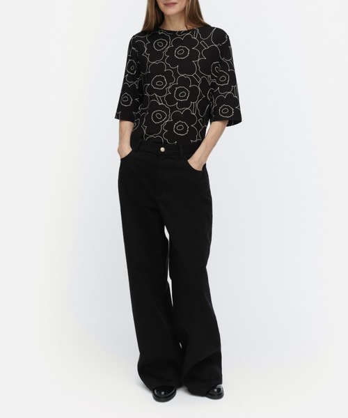 【テキスタイルデザイン:Maija Isola(マイヤ・イソラ)】 Piirto Unikko(ピィイルト ウニッコ):ドローイング・ウニッコ黒ベースのUnikko柄がクールなTシャツ。つかず離れずのシルエットで着心地良く、スマートな着こなしが可能に。長めの5分袖も、ロングシーズン活躍するポイントです。※品質表示は、Marimekko社の付けた洗濯表示を日本国内の基準に合わせ付け替えております。本国のタグはカットされておりますので、予めご了承ください。※断裁により商品ひとつずつの柄の出かたが異なるため、表示画像のディテールと多少異なるデザインのものが届く場合がございます。予めご了承ください。モデル着用サイズ:M/038/004