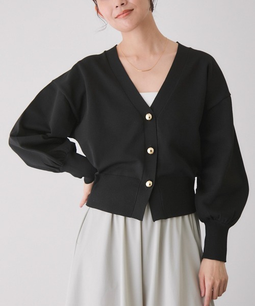 1枚で主役にも、羽織りにも。着回し自在の万能アイテム。【デザイン・シルエット】・Vネックデザインが、首周りをすっきりと美しく見せます。・存在感のあるゴールドボタンが、シンプルなデザインに華やかさを添えます。・コンパクトな着丈で、どんなボトムスともバランスよく着こなせます。・袖は程よいボリュームを持たせ、女性らしさを引き立たせます。・前を開けて羽織りとしても、ボタンを閉じてトップスとしても着られる2WAY仕様です。【素材感】・柔らかな肌触りのハイゲージニット素材で、素肌に触れてもチクチクしません。・程よい厚みで、秋口から春先までロングシーズン活躍します。・伸縮性があり、動きやすく、ストレスフリーな着心地です。・上質な素材感が、カジュアルになりすぎない大人の上品さを演出します。【カラー】 01 クロメイン 06 チャコール 07 グレー 15 オフサブ 20 コゲ茶メイン【スタイリングポイント】・ハイウエストのスカートやパンツと合わせると、スタイルアップ効果が期待できます。・きれいめなブラウスやワンピースの上に羽織れば、上品なオフィススタイルに。・デニムやカットソーと合わせれば、洗練された大人のカジュアルスタイルが完成。・プリーツスカートやフレアスカートと合わせると、フェミニンな雰囲気に。・シンプルなデザインなので、柄物のボトムスやスカートとも相性抜群です。・オンオフ問わず、様々なシーンで活躍する万能アイテムです。裏地:なし光沢感:なし透け感:なしポケット:なし伸縮性:あり生地の厚さ:普通ボタン:ありその他仕様:なし季節:春秋冬※撮影時の光、お使いのモニター環境によって色の見え方が違う場合がございます。予めご了承ください。モデル身長:167cm 着用サイズ:M