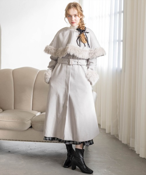 トレンド感とクラシカルな雰囲気を兼ね備えた一枚!ファー付き2wayケープロングコート【デザイン】ふわりと広がるケープにファーをあしらった華やかなロングコートです。ケープは取り外し可能で、シンプルなノーカラーコートとしても着られる2way仕様。付属のベルトでウエストマークすれば、スタイルアップも叶います。【素材感】着心地の軽いポリエステル素材伸縮性:なし/ 透け感:なし / 裏地:あり水洗いによる洗濯不可 / ドライクリーニング可【コーディネート】ケープを付けてスカートやワンピースと合わせれば、デートや女子会コーデにおすすめ◎ケープを外したノーカラーデザインを活かせば、オフィスやフォーマルシーンでも着られる万能コーデに。【※お取り扱い上のご注意】1:モニター環境等により実際の商品と多少色味が異なって表示される場合がございます。予めご了承下さい。2:屋外で撮影された商品は、天候により多少実際のカラーと異なる場合があります。商品のカラーはトルソー(マネキン)の商品画像をご参照ください。3:濃い色の商品は、お洗濯や摩擦等による移染にご注意ください。4:末永くご愛用頂く為に、アテンションタグ・洗濯ネームを必ずご確認の上、着用又はお取り扱い下さい。5:生産時期により、色、サイズ、デザイン、素材の質感が多少が異なる場合がございます。あらかじめ御了承下さいませ。