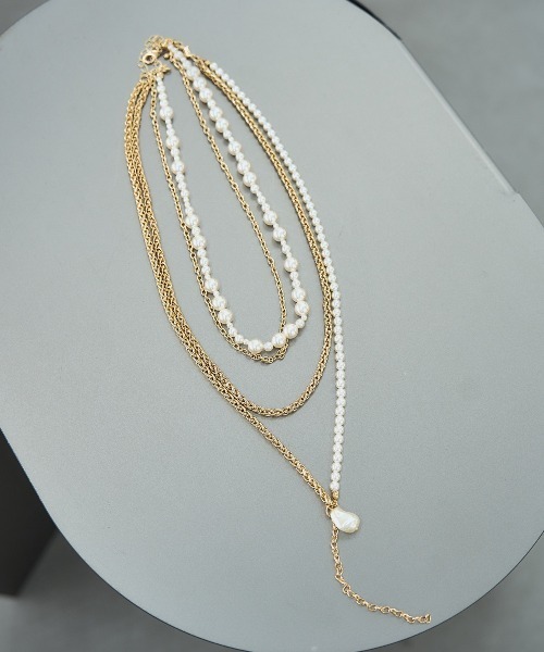 ーーー 長さの違う二連ネックレスが存在感抜群! パールが華やかさをプラスできるネックレス ーーー point □デザインが異なる2本セットのネックレス □どちらも二連デザインで一つで付けたり重ね付けしたりとマルチに楽しめる □ショートネックレスはランダムパールが主役になるバランスで少し細目なチェーンの組み合わせ □ロングネックレスはパールとチェーンの切替でトップのパールがアクセントに styling ショートネックレス、ロングネックレスと長さもそれぞれ違う為、スタイリングやシーンを選ばずに使っていただける万能アイテムです。 お仕事、オケージョンシーン、プライベートで大人っぽさをプラスしてくれます。 ※加工を施した画像を使用しております。 実物と色味が異なる可能性があるため、色味は詳細後ろにある生地寄り画像を参考にお願いいたします。 あらかじめご了承下さい。