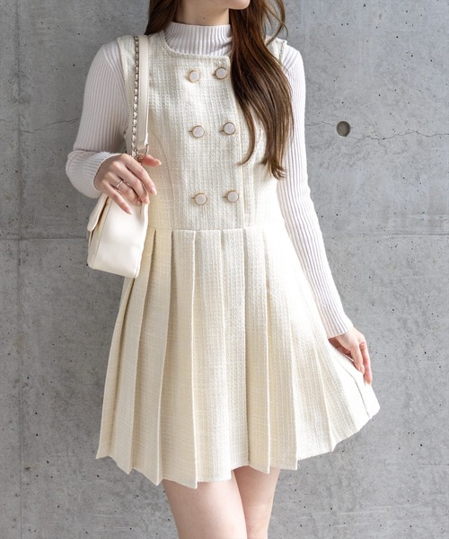 デイリーから特別な日まで映える!ツイードプリーツミニワンピース【デザイン】上品なツイード素材を使用したプリーツデザインのミニワンピースです。フロントのボタンはワンピースと同色にすることで、より洗練された印象に仕上げています。クラシカルな雰囲気と可愛らしさを兼ね備えた一枚です。【素材感】着心地の軽いポリエステル素材伸縮性:なし/ 透け感:なし/ 裏地:なし 水洗いによる洗濯不可 / ドライクリーニング可【コーディネート】カーディガンやショートジャケットを羽織れば、上品さを引き立てた大人ガーリースタイルに。シンプルなアクセサリーを合わせることで、華やかさの中に落ち着いた雰囲気を演出できます。特別なお出かけやディナーシーンにもぴったりの一枚です。【※お取り扱い上のご注意】1:モニター環境等により実際の商品と多少色味が異なって表示される場合がございます。予めご了承下さい。2:屋外で撮影された商品は、天候により多少実際のカラーと異なる場合があります。商品のカラーはトルソー(マネキン)の商品画像をご参照ください。3:濃い色の商品は、お洗濯や摩擦等による移染にご注意ください。4:末永くご愛用頂く為に、アテンションタグ・洗濯ネームを必ずご確認の上、着用又はお取り扱い下さい。5:生産時期により、色、サイズ、デザイン、素材の質感が多少が異なる場合がございます。あらかじめ御了承下さいませ。