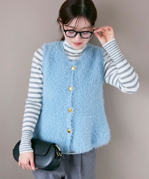 《WEB限定アイテム》毛足が特徴のフェザーヤーンを使ったVネックベストボタン使いがアクセント、きれいめで上品な印象♪縦ラインでスッキリ見えも叶います。裾に向けて緩やかなフレアシルエットで女性らしい印象をプラスパンツでカジュアルに、スカート合わせでフェミニンにもお使いいただけます。ご自宅でのお洗濯も可能です。