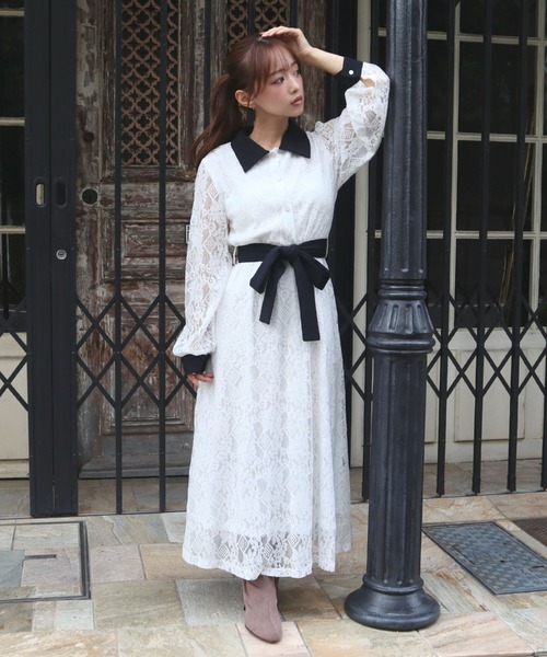 大人な雰囲気のレースワンピース。合わせるアウターや足元のコーデによって大人っぽいスタイリングからガーリー韓国ファッションスタイルまで楽しめます。リボンベルトでウエストをマークすればスタイルUP効果も◎オフィスカジュアルやちょっとした特別な日にもオススメの1着です。上品な総レース使いでオケージョンシーンにもピッタリ。キラキラなパール釦がぐっと上品さもプラスしてくれます。■共生地ベルト付■後ろウエストゴム仕様■裏地付