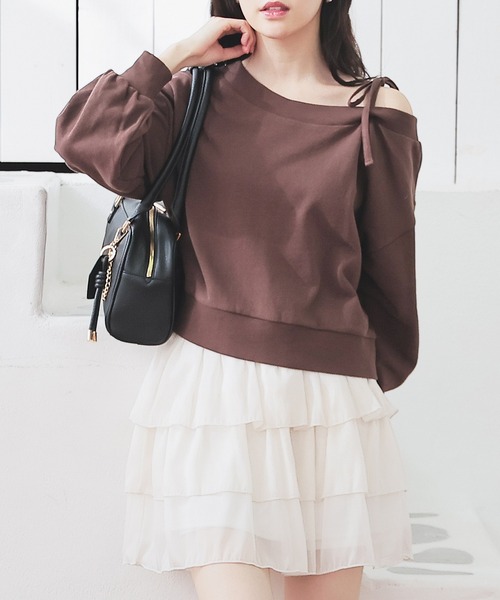 程よい肌見せでお洒落に 【デザイン】 肩を少し落としたオフショルダーにリボンを付けた程よい肌見せで、フェミニンでトレンド感のあるデザイン。 ゆったりした幅と短めの丈感。 【素材・機能】 ロングシーズン使える、綿100%の裏毛素材。 【スタイル】 ロングボトムを合わせるとお洒落見えする大人スタイルに♪ 品番:685-11-9801