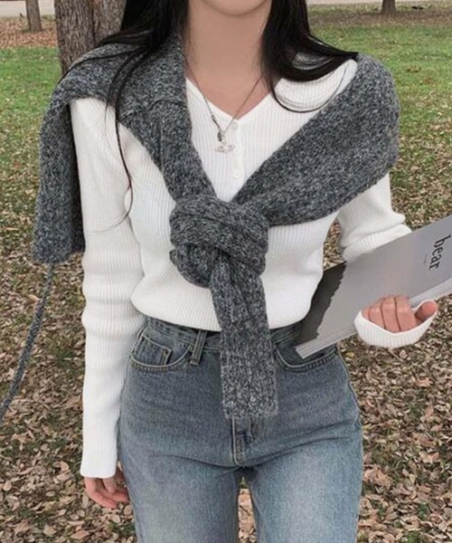 デコルテをきれいに魅せる、ヘンリーVネックの上品リブニット。■デザインVネックとヘンリーボタンの組み合わせが大人っぽい印象を与えるリブニット。ボディラインにほどよく沿うコンパクトなシルエットで、すっきりと女性らしい着こなしに。シンプルながらもボタンディテールがアクセントになり、1枚でも様になるデザインです。■素材柔らかく伸びのあるアクリル素材を使用。軽やかでチクチクしにくく、長時間着ても快適な肌触り。程よい厚みで、インナー使いにもぴったり。■スタイリングデニムやタックパンツと合わせてきれいめカジュアルに。ジャケットやカーディガンのインナーとしても使いやすく、通勤コーデにもおすすめ。シンプルなデザインで、アクセサリーやスカーフとの相性も◎。-----------------------------透け感:なし伸縮性:あり裏地:なし------------------------------------------------------------【スタッフが着用しました!】身長:158cm普段着用サイズ:S~Mサイズ今回着用サイズ:FREEサイズ■着用感フィット感のあるシルエットながら、伸縮性のある素材で動きやすい着心地。コンパクトな丈感がボトムスを選ばず、すっきりとバランス良く着られます。------------------------------------------------【お買い物をよりお楽しみいただく為に】▼お気に入り登録サイズ・カラーを指定して、♡マークをクリック![セール通知・ラスト1点の通知・完売アイテムの再入荷通知]を受け取ることができます。▼ブランドのお気に入り登録新商品や再入荷、タイムセールやクーポン等いち早くブランドのお得な情報を受け取ることができます。------------------------------------------------※取り扱い上のご注意染色の特性上、発汗や摩擦により色落ちしたり他のものに色移りすることがありますのでご注意ください。韓国 オフィスカジュアルガーリー大人カジュアル韓国ファッション秋服冬服