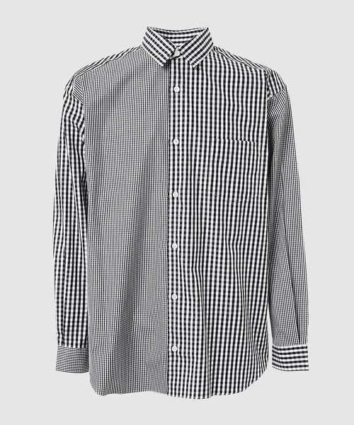 一見シンプルなチェックのファブリックを使用したシャツは、2種類の大きさの異なるギンガムチェックでパーツが切り替えられたギミックの利いたデザイン。大きめなギンガムチェックと細かなギンガムチェックをパーツを分けて使用し、一枚のシャツに仕立てられています。2種類の異なるチェックながらも両方ともブラック×ホワイトの掛け合わせによるチェック生地を使用する事で落ち着いたひとまとまりのあるデザインに仕立てられた一枚です。 This shirt, made from a seemingly simple checked fabric, has a clever design with two different sized gingham checks used as separate parts. The shirt is made from a large gingham check and a small gingham check, and both are made from separate parts. Although the checks are two different types, both are made from a black and white check fabric, giving the shirt a calm and cohesive design.