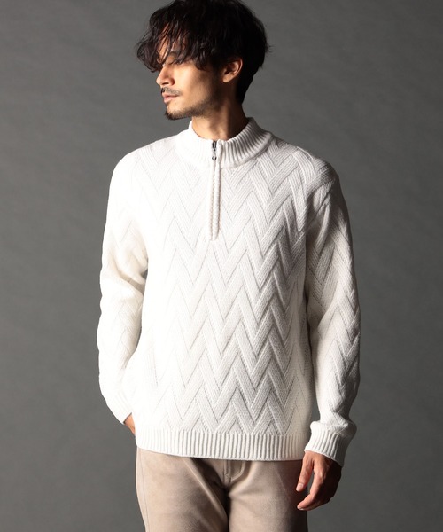 ■デザイン上品な編地の交差柄とスッキリとした衿元がアクセントのハーフジップポロニット。軽量で膨らみのあるソフトな風合いがウォーム感のある仕上がりです。■サイズほどよいゆとり感がありながら ウエストにやや絞りを入れたシャープなシルエットが魅力です。■素材キックバック性に優れ 軽量で膨らみのあるアクリル糸を採用。ストレッチ性により編み目が引き締まり 交差柄に上品な凹凸感が生まれます。糸3本取りによるカラーミックスの表現で高見えする仕上がりになっています。※19ライトグレーは、引き揃えたオフ×ライトグレーカラーになります。60ブルーは、引き揃えたブルー×ネイビーカラーになります。伸縮性:あり厚み:中厚仕上げ■注意点生地の性質上、摩擦によりピリングが起こることがあります。着用時及びクリーニング等の取り扱いに御注意ください。この製品は生地組織の性質上、引っ掛けやすくなっております。引っ掛けた場合の補修は、非常にむずかしくなりますので、着用時、保管時の取り扱いには十分に御注意下さい。この製品は、素材や編地の特性上、伸びやすいので、着用にならないときは形や風合いを保つ為、ハンガーに掛けず、軽くたたんで平らにして保管して下さい。※画像の商品はサンプルです。実際の商品とは仕様・加工・サイズ・素材が若干異なる場合がございます。※ 掲載画像の商品の色味は、撮影場所や光の当たり具合などにより色味が異なって見える場合がございます。商品の色味は、生地アップの画像をご参照ください。また、お客様のお使いのPC・スマートフォン等のモニター環境などにより色味が異なって見える場合がございます。予めご了承の上ご注文ください。