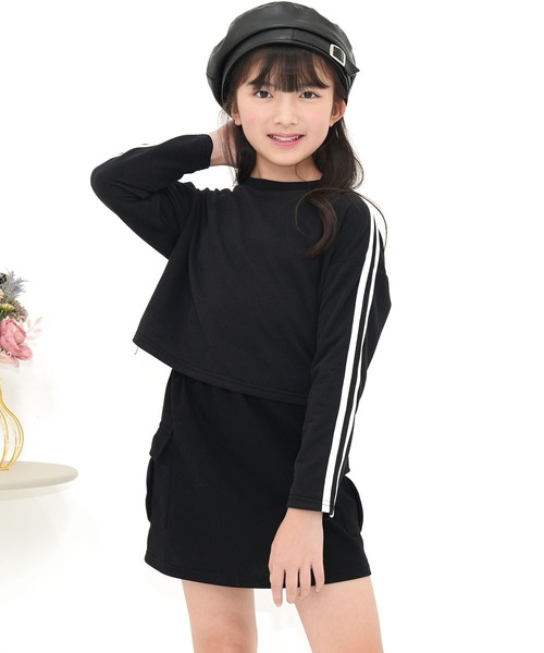 サイドライン×カーゴスカートでスポーティ且つシンプルで、大人っぽいコーデが完成!! スカートはポケット付きで 通園通学にも使いやすく、 ウエストゴムで履き心地も抜群★