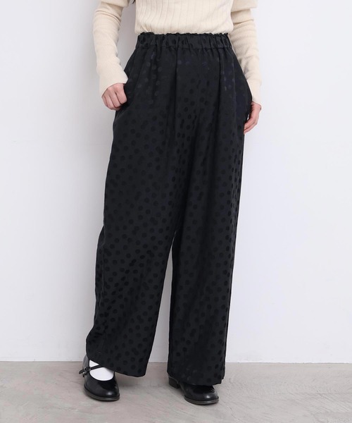 動くたびにきらりと光り、黒のなかにドットが浮いているような。つるつるとしたドットの面がサテンになったオリジナルのジャガード生地。すとんとしたシルエットのパンツはキャミとセットで着ると新しい気分で着られるオケージョンに。ドットの部分だけ光沢感があるので、決まりすぎずほどよく綺麗めな雰囲気。ニットやスニーカーなどカジュアルに普段使いもおすすめです。※着用商品はサンプルです。実際の商品と仕様、加工、サイズが若干異なる場合がございます。※光の関係で実物の商品の色味とは若干異なる場合がございます。実際に近い色味は詳細画像をご参照下さい。※取り扱いの注意については取り扱い表示をよくご確認の上、着用をお願いいたします。【素材の特性、お取り扱いの注意】・こちらの製品に使用しております素材は大変デリケートな素材を使用しており、さける恐れがある為、はげしい運動などは避けて、着用時は十分に気をつけて頂ける様、お願い致します。また、性質上、破損しやすく、糸引きやひきつれが起こりやすいので着用、着脱時、アクセサリー等には十分御注意下さい。・この製品は、レーヨン素材を使用しておりますので、下記の点にご注意ください。●水に濡れた場合に、縮みやすく、毛羽立ちやすい特性がありますので、雨の日の着用には十分お気をつけください。●水ジミ、雨、汗によるシミが付いた場合は、直ちにドライクリーニングして下さい。・この製品は、素材の特性上、汗や雨等でぬれた時、摩擦等で、多少の色落ち、移染することがありますのでご注意下さい。・独特の風合いを出すため製品洗いをしてます。一枚一枚の色味、風合い、サイズ等も微妙に違います。素材の特性上、しわが出来やすいのですが、他の製品では味わえない雰囲気をお楽しみください。・この製品を洗濯する際には多少縮む場合がありますので、形を整えてから日陰で干して下さい。l'atelier du savon(アトリエドゥサボン) CONCEPT 1つ1つにかけられた手のぬくもり日々の生活に、少しのデザインを加えた大人の日常着あそび心とあたたかみ