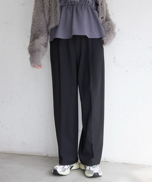 暖かくて素敵に決まる、履き心地と美シルエットに拘ったストレートパンツ。◆2025秋冬◆<POINT>・裏起毛の暖かさが気持ちの良いパンツ。・アンチピリング・イージーケア付きの嬉しい素材感。・ウエスト周りにポイントのあるデザイン。・センタープレスでキレイ見え。【デザイン・シルエット】ウエストにポイントのあるパンツです。すっきりとしたストレートシルエットですが、タックを入れているので腰回りはややゆとりがあります。後ろサイドにこっそりゴムを入れ履き心地と美シルエットに拘ったパンツです。ウエストベルト部分はカッティングを入れトップスがキレイに見えるようデザイン。ベルト付きで、ウエストに目が行きます。ベルト穴付きなので自分のサイズに調整可能です。長め丈が好きな方はワンサイズ上げてもベルトでウエストは調節可能です。同シリーズのツータックワイドパンツ(品番:BVS65300)も展開。【素材】履き心地の良いストレッチ性のある裏起毛の素材。防シワ・アンチピリング機能付き。洗濯機で洗えるので日々のお手入れも簡単。【カラー】ベーシックなブラック、クラシカルなイメージのグレー系ウィンドウペーングレンチェック、コーディネートのポイントにもなる大人キャメルの3色展開です。【おすすめスタイリング】ハイゲージニットとの相性がいいですがストレートで幅が広くないストレートシルエットなのでスエットやシャツとの合わせもすっきり着用いただけます。ブラウスやジャケットと合わせて通勤/オフィスカジュアルにも対応。-----------------------------裏地:なし光沢感:なし透け感:なし伸縮性:なしウエスト:後ろ一部にゴムありファスナー:前にありポケット:ありボタン:なし生地の厚さ:普通その他仕様:ベルト付き季節:秋、冬-----------------------------【モデル着用サイズ】メイン着用モデル身長:164cm 着用サイズ:M詳細モデル身長:168cm 着用サイズ:M※画像の商品はサンプルです。実際の商品と仕様、加工、サイズが若干異なる場合がございます。※画像によっては実際の色味と異なる場合があります。正しい色味は生地アップ画像をご確認ください。