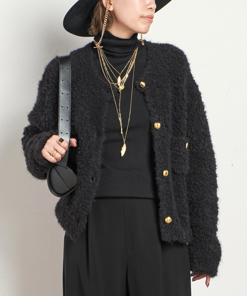 まるでツイードジャケットのようなニットジャケット。 くるくるふわふわの編地が愛らしく、堅苦しくなくカジュアルダウンして取り入れられるジャケットです。 着て頂くと驚くほど軽く、ストレスフリーな着心地も魅力のひとつ。 金ボタンがポイントになってくれる一枚で、スラックスでキレイ目に合わせてもデニムでカジュアルに合わせても素敵です。 ※照明の関係により、実際よりも色味が違って見える場合があります。 またパソコン・スマートフォンなどの環境により、若干製品と画像のカラーが異なる場合もございます。 ※商品の色味は、商品アップ画像をご参照ください。 モデルサイズ:H162 着用サイズ:フリー 本体:ドライクリーニング